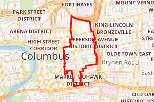 The Discovery District has slightly varying boundaries depending on the source. The Discovery District is bounded to the north by I-670, to the east by Jefferson Avenue and Lester Drive, to the south in a zig-zag pattern until it reaches I-70, and then to the west by South Grant Avenue.