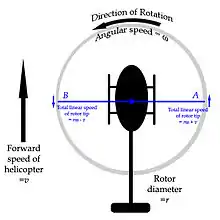 Now imagine the helicopter in forward flight at, say, v meters per second. The speed of the blade-tip at point A in the diagram relative to the air is the sum of the blade-tip speed and the helicopter forward-flight speed: rω+v. But the blade-tip speed at point B, relative to the air, is the difference of its rotational speed and the forward-flight speed: rω-v.