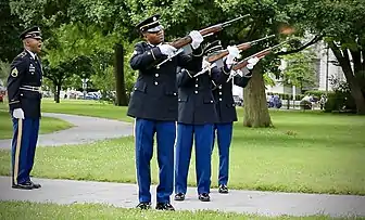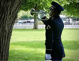 The pictures below depict the DCARNG Honor Guard participating in Memorial Day ceremonies, held at President's Park, in Washington, DC, during 2018 and 2019. The DCARNG Honor Guard supported the 1st Infantry Division's Memorial Day annual ceremony.[14] In a few pictures shown below, Honor Guardsmen are playing "Taps", giving a three-volley salute, and standing ready to give military honors to fallen comrades.