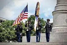 The picture above depicts the DCARNG Honor Guard members presenting the US flag during a Memorial Day ceremony held on May 27, 2019. The ceremony was in support of the US Army, 1st Infantry Division and was held on the grounds of the White House, in President's Park.[2]