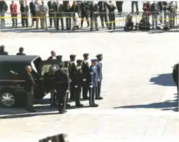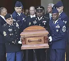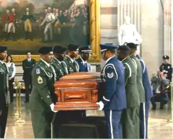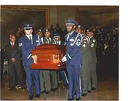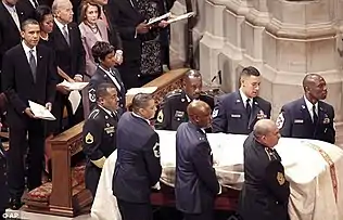 The photographs below show the DCARNG Honor Guardsmen and Airmen participating jointly in the funeral service of civil rights activist, Dorothy Height. The service was held on April 29, 2010, at the US National Cathedral building, Washington, DC. The eulogy was performed by former US President, Barrack Obama.[13] The Honor Guard composition depicts a 6-man pallbearer team.