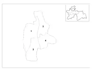 As of 2020, the regions of Tajikistan are subdivided into 47 districts (Tajik: ноҳия, nohiya or Russian: район, rayon), not including 4 districts belonging to the capital city Dushanbe, and 18 cities of regional subordination (including Dushanbe, an extraregional capital city).[1] Before ca. 2017, there were 58 districts.[2][3][4] The districts are further subdivided into rural municipalities called jamoats, which in turn are further subdivided into villages (or deha or qyshqol).