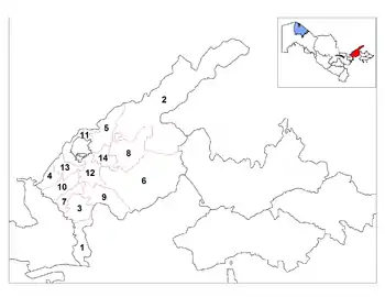 *Kegeyli district was created in 2004 by the merger of former Bozatau district (the northern part of district 5 on the map) and former Kegeyli district (the south-eastern part of district 5). This merger was effected by Resolution 598-II of the Oliy Majlis of the Republic of Uzbekistan (11 February 2004) and Resolution 225 of the Cabinet of Ministers of the Republic of Uzbekistan (11 May 2004), which abolished Bozatau district and created the enlarged Kegeyli district. Prior to that date, there were 15 districts in Karakalpakstan. See Cabinet of Ministers of the Republic of Karakalpakstan and Karakalpakstan on gov.uz.