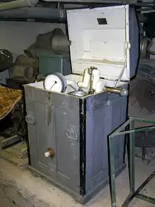 Flow of air through the helmet could be controlled by manually adjusting the back-pressure on the helmet exhaust valve, usually on the lower right side of the bonnet, and by manually adjusting the inlet supply valve on the airline, usually fastened to the front lower left of the corselet.[5] Flow rate would also be affected by the surface delivery system and depth. Manual pumps would be operated at the speed necessary for sufficient air supply, which could be judged by delivery pressure and feedback from the diver. Many manual pumps had delivery pressure gauges calibrated in units of water depth - feet or metres of water column - which would provide the supervisor with a reasonable indication of diver depth. If the diver needed more air, the operators would have to crank faster.