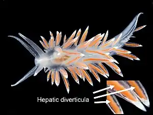 As applied to mollusks, the New Latin term diverticulum is an anatomical feature. The term is most often encountered in the plural form as "diverticula", "hepatic diverticula", or "digestive diverticula", which are anatomical terms for organs which are visible from the outside of the body in a clade of sea slugs known as aeolid nudibranchs, marine opisthobranch gastropod molluscs.[1]