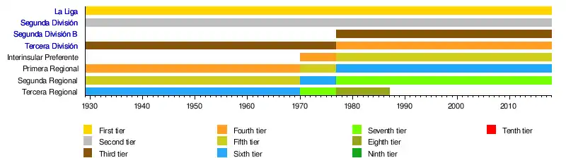 Segunda Interinsular de Tenerife is the 7th level of competition in Tenerife. The league is played with 38 teams in one group of 20 and another group of 18. At the end of the season, the champions are promoted. Runners-up, 3rd, 4th and 5th placed teams enter promotion playoff for two additional promotions.