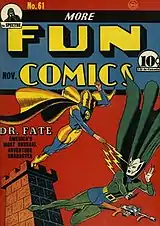 Kent Nelson as Doctor Fate debuted in his own self-titled six page strip in More Fun Comics #55 (May 1940) during the Golden Age of Comic Books. The character was created by writer Gardner Fox and artist Howard Sherman, who produced the first three years of monthly Doctor Fate stories.[1] After a year with no background, his alter ego and origins were shown in More Fun Comics #67 (May 1941).[2]