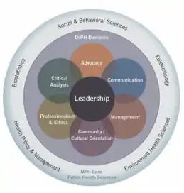 The common elements addressed in all DrPH degrees are: 1) a professionally oriented and competency-based curriculum and 2) core competency domains.[4] The DrPH core competency model highlights the transformative leadership role that DrPH graduates play in advancing the field of research and practice in public health. According to The Association of Schools of Public Health (ASPH), the DrPH competency model has seven domains of skills that every DrPH program should aim to develop: