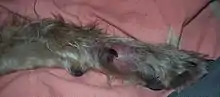 Grapes and raisins can cause acute kidney failure in dogs[40] (see also grape and raisin toxicity in dogs). The exact mechanism is unknown, nor is there any means to determine the susceptibility of an individual dog. While as little as one raisin can be toxic to a susceptible 10 pounds (4.5 kg) dog, some other dogs have eaten as much as a pound of grapes or raisins at a time without ill effects. The affected dog usually vomits a few hours after consumption and begins showing signs of kidney failure three to five days later. A mycotoxin is suspected to be involved, but one has not been found in grapes or raisins ingested by affected dogs. The reason some dogs develop kidney failure following ingestion of grapes and raisins is not known.[41][42][43][44] The most common pathological finding is proximal renal tubular necrosis.[45]