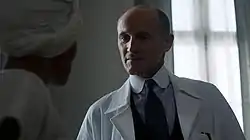 - Barton Mathis, renamed Dr. Francis Dulmacher,[17] appears in Gotham portrayed by Colm Feore.[18] This version of the character is described as a "mad European scientist". He has done various experiments and even found ways of reviving the dead.[19] The Dollmaker was first mentioned in the episode "Selina Kyle", in which he has two of his minions named Patti and Doug to pose as members of the Mayor's Homeless Outreach Program to kidnap street kids as part of a child-trafficking ring while using Trident Intercontinental Shipping as a front for their smuggling. When the Dollmaker's minions get the street kids, they ship them off to the Dollmaker's lair. Detectives James Gordon and Harvey Bullock end the trafficking ring, however.[20] Through the events of "The Scarecrow", "The Blind Fortune Teller", and "Red Hood", it is revealed that the Dollmaker has been kidnapping and imprisoning people for unknown purposes, among them being Fish Mooney. Mooney eventually learns from the Dollmaker's office manager that they are intended to be used for organ trade and the Dollmaker's surgical experiments. To evade having her eyes used in the Dollmaker's experiments, Mooney rips out her left eye with a spoon and steps on it before collapsing. The Dollmaker makes his first physical appearance in the episode "Everyone Has a Cobblepot", in which he visits an imprisoned Mooney upon learning that she tore out her own eye to avoid being used for organ trafficking. Mooney tells the Dollmaker about her history with Carmine Falcone and attempts to convince him to let her become his partner. To show her the consequences of failing him, the Dollmaker shows her one of his experiments: the former office manager whom he butchered and reassembled with different female body parts. The Dollmaker finds it amusing. In order to prove herself to him, Mooney ends a mutiny among the prisoners and secures the release of a guard the prisoners took hostage. After the job is done, the Dollmaker welcomes her to the upper management. Upon looking outside the window, Mooney finds that his facility is on a remote island somewhere off the European coast. The Dollmaker confronts Mooney as she tries to escape and threatens to turn her into one of his patchwork creations. Before he could do that, the unlocked prison cell enabled the other prisoners to get out while knocking out and wounding the Dollmaker in the process.[21]