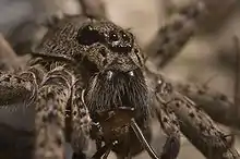 Rather than hunting on land or by waiting in a web, these spiders hunt on the water surface itself, preying on mayflies, other aquatic insects, and even small fish.[4][5] For fishing spiders, the water surface serves the same function as a web does for other spiders. They extend their legs onto the surface, feeling for vibrations given off by prey.