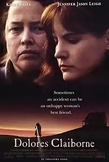 Dolores Claiborne is a 1995 American psychological thriller drama film directed by Taylor Hackford and starring Kathy Bates, Jennifer Jason Leigh, Christopher Plummer, and David Strathairn. It is based on the 1992 novel of the same name by Stephen King. The plot focuses on the strained relationship between a mother and her daughter, largely told through flashbacks, after her daughter arrives to her remote hometown on a Maine island where her mother has been accused of murdering the elderly woman for whom she cared.[4]