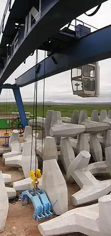 A dolos (plural: dolosse) is a reinforced concrete block in a complex geometric shape weighing up to 80 tonnes (88 short tons), used in great numbers as a form of coastal management to build revetments for protection against the erosive force of waves from a body of water.[1] The dolos was invented in 1963, and was first deployed in 1964 on the breakwater of East London, a South African port city.[2][3]