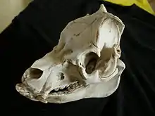 The domestic pig typically has a large head, with a long snout which is strengthened by a special prenasal bone and a disk of cartilage at the tip.[2] The snout is used to dig into the soil to find food, and is a very acute sense organ. The dental formula of adult pigs is 3.1.4.33.1.4.3, giving a total of 44 teeth. The rear teeth are adapted for crushing. In the male the canine teeth can form tusks, which grow continuously and are sharpened by constantly being ground against each other.[2]