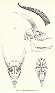 The dorcas gazelle (Gazella dorcas), also known as the ariel gazelle, is a small and common gazelle. The dorcas gazelle stands about 55–65 cm (1.8–2.1 feet) at the shoulder, with a head and body length of 90–110 cm (3–3.5 feet) and a weight of 15–20 kg (33–44 pounds). The numerous subspecies survive on vegetation in grassland, steppe, wadis, mountain desert and in semidesert climates of Africa and Arabia. About 35,000–40,000 exist in the wild. The extinct Saudi gazelle from the Arabian Peninsula has been previously considered as a subspecies of the dorcas gazelle.