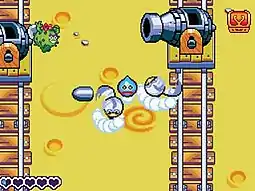 Another primary game mechanic is the tank battles. Tank battles either occur in the stages or at the tank battle arena in Boingburg. In stages, when the player encounters a platform with an enemy on it standing in front of a slime-shaped tank, he or she may summon his or her tank to do battle with them.[4] When the player goes into the battle, the top screen displays a zoomed out view of the two tanks on either side of the screen, and the bottom screen displays the standard gameplay.[4] Each tank has two cannons that ammunition may be loaded into, and an HP meter, the latter which varies from tank to tank.[4] Ammunition comes from varying points in the tank; the location of these drop points varies depending on which tank is being used.[4] The player picks up ammunition using the Elasto Blast, like he or she picks up items in the other mode of play. He or she then may throw the ammunition into one or both of the cannons, causing the ammunition to be fired at the opposing tank. The opponent, however, will also fire ammunition at the player's tank. If two pieces of ammunition collide with each other, both pieces will fall to the ground, though some pieces of ammunition have more defensive and/or offensive power than others.[4]