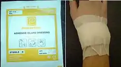 Dressings are usually secured with adhesive tape and/or a bandage. Many dressings today are produced as an "island" surrounded by an adhesive backing, ready for immediate application – these are known as island dressings.