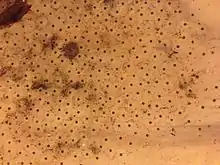 Dryophytes gratiosus is the largest native tree frog in the United States, acquiring its name from the raucous and explosive call.[2] It is 5 to 7 cm (2.0 to 2.8 in) in head-body length.[3] It is variable in color, but easily recognizable due to the characteristic dark, round markings on its dorsum. Individuals may be bright or dull green, brown, yellowish, or gray in color with small, grey and green-yellow spots. It has prominent, round toe pads, and the male has a large vocal sac. Dryophytes gratiosus has skin that is unlike any other species of American frog.[2] Its skin is neither rough and warty not smooth, having skin that is thick and leathery. Its skin can also shift colors depending on lighting, time of day, temperature, or its surroundings.[3] Changes in color can be rapid and the spots can seem to disappear and reappear over time.[2] The eyes of Dryophytes gratiosus are brown, gold, and black.