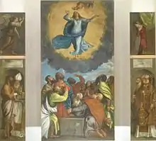 The building features a high nave, separated by massive columns from the two aisles, three apses and a grand Baroque dome at the intersection of the nave and the transepts.[3] The main altar holds a polyptych by Titian, portraying a version of the Assumption of the Virgin.[8] This painting probably dates from 1552;[3] the side altars hold paintings of Italian and Dalmatian masters of later centuries.[3]