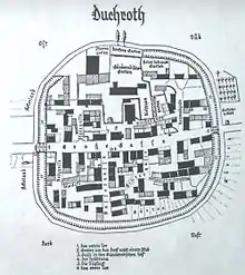 From time to time in the Middle Ages, the Knights of Montfort drew their subjects in Duchroth into their disputes with other nobles. In the 1335 feud with St. Stephen's Collegiate Foundation in Mainz, for example, the villagers were armed and led into battle as a militant cohort. The Montforts, for their part, assumed a duty to protect their subjects, by giving the village Pfortenrecht (“gate rights”), whereby the villagers were allowed to build two fortified gates and to gird their village with a moat and an abatis. Even the churchyard was fortified with a mighty wall and incorporated into the defensive complex. Also belonging to this was a hefty stone defensive tower, actually the churchtower, with arrowslits, which the municipality built. This tower even withstood the pickaxe after the great fire in 1905 and had to be demolished with explosives. The mediaeval village court was always anxious to keep the fence around the village gapless. The defensive system herein described likely proved its worth during the “Duchroth War” in 1418, for Duke Stephan of Zweibrücken, in the agreement of atonement, reserved to himself the right to avail himself of the two villages of Duchroth and Oberhausen along with their churchyards in case of feud. The moat that the villagers dug around their village defined its shape as a clump village. The only ways into the village then were the two gates, the Untertor (Lower Gate) and the Obertor (Upper Gate). The former stood where the Ringpfad (“ring path”) now crosses Naheweinstraße. Except for the village thoroughfare, then known as the Große Gasse (“Great Lane”), running from one village gate to the other, all village streets were dead ends, ending at either a yard or the village's edge. The mediaeval fortifications around Duchroth, and the two gates no longer exist. Nevertheless, the Historischer Ringpfad still follows the alignment of the now long gone moat.[12]