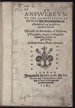 Dudley Fenner (c. 1558–1587) was an English puritan divine. He helped popularise Ramist logic in the English language. Fenner was also one of the first theologians to use the term "covenant of works" to describe God's relationship with Adam in the Book of Genesis.[1]
