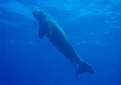 The dugong's tail flukes[20] and flippers[16] are similar to those of dolphins. These flukes are raised up and down in long strokes to move the animal forward, and can be twisted to turn. The forelimbs are paddle-like flippers which aid in turning and slowing.[17] The dugong lacks nails on its flippers, which are only 15% of a dugong's body length.[17] The tail has deep notches.[21]