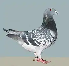 The Dutch Beauty Homer is a breed of fancy pigeon. Dutch Beauty Homers, along with other varieties of domesticated pigeons, are all descendants from the rock pigeon (Columba livia). This breed of pigeon is known for their characteristic grey feathers and red eyes. They emit a cooing noise typical of most pigeon species. The Dutch Beauty Homer is most famous for its use as mail carriers during World War II. In the modern era, Dutch Beauty Homer pigeons are collected and most notably seen in bird beauty pageant shows, where they are judged on plumage, shape, and general health.