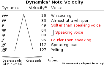 | Logic Pro 9 dynamics[24] | 16 | 32 | 48 | 64 | 80 | 96 | 112 | 127 | ||