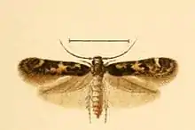 The wingspan is about 9–10 mm. The ground colour of the forewings is yellowish, sprinkled with blackish-grey. The hindwings are grey.[2]