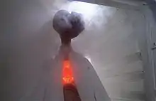 Carlo Rambaldi, who designed the aliens for Close Encounters of the Third Kind, was hired to design the animatronics of E.T. Rambaldi's own painting Women of Delta led him to give the creature a unique, extendable neck.[7] Its face was inspired by those of Carl Sandburg, Albert Einstein, and Ernest Hemingway.[10] Producer Kathleen Kennedy visited the Jules Stein Eye Institute to study real and glass eyes. She hired Institute staffers to create E.T.'s eyes, which she felt were particularly important in engaging the audience.[11] Four heads were created for filming, one as the main animatronic and the others for facial expressions, as well as a costume.[10] A team of puppeteers controlled E.T.'s face with animatronics. Two little people, Tamara De Treaux and Pat Bilon,[5] as well as 12-year-old Matthew DeMeritt, who was born without legs,[12] took turns wearing the costume, depending on what scene was being filmed. DeMeritt actually walked on his hands and played all scenes where he walked awkwardly or fell over. The head was placed above that of the actors, and the actors could see through slits in its chest.[7] Caprice Roth, a professional mime, filled prosthetics to play E.T.'s hands.[11] The puppet was created in three months at the cost of $1.5 million.[13] Spielberg declared it was "something that only a mother could love".[7]