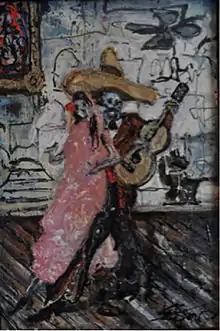 Local familiarity with Mexican cultural history led to artworks which took on distinctive Mexican themes and characters and which paid tribute to the subtleties of the Mexican culture - from Lucha Libre and Mexico's love of free-wrestling to “Día de los Muertos” (Day of the Dead), which is a Mexican national holiday to celebrate, pray for, and to honor departed loved ones. Such artworks include Mays' "The Dead Dance", which conveyed the Mexican dead celebrating in skeletal forms. His “Last Train to Chihuahua”, which depicts a revolution-era train arriving at a station, received wide coverage in local newspapers, and “The Birth of The Mestizo”, combine many elements of pre-Hispanic Mexican Aztec culture's encounter with the Conquistadores, and the resulting post-Hispanic Mexico - where the eagle perched on cactus devoured the snake, which today, remains a part of the Coat of arms of Mexico