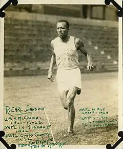 Richard Earle "Earl" Johnson (March 10, 1891 in Woodstock, Virginia – November 19, 1965) was an American athlete who competed mainly in the cross country team. He was the 1921 National Champion. He effectively defended his championship in 1922 as he was beaten by Ville Ritola's Van Cortlandt Park course record, but since Ritola was Finnish, Johnson was the first American finisher in the National Championships. A rare black athlete of his day, he worked for the Edgar Thomson Steel Works in Pittsburgh, Pennsylvania.[1]