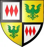 ![]() ![]() Quarterly, first and fourth, Argent, three lozenges conjoined in fess Gules, within a border Sable; for Montagu. Second and third, Or, an eagle displayed Vert, beaked and membered Gules; for Monthermer. | |