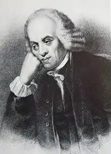 Johnson's future now began to look uncertain, as his father was deeply in debt.[38] To earn money, Johnson stitched books for his father, although poor eyesight—a result of his childhood illness—meant he eschewed the work involved. It is possible that Johnson spent most of his time in his father's bookshop reading various works and building his literary knowledge. During this time, Johnson met Gilbert Walmesley, the Registrar of the Ecclesiastical Court and a frequent visitor to the bookshop.[39] Walmesley took a liking to Johnson, and the two discussed various intellectual topics during the two years Johnson spent working in the shop.[40] Their relationship was soon put on hold; Sarah Johnson's cousin, Elizabeth Harriotts, died in February 1728 and left her £40 (about £5,400 as of 2021), which was used to send Johnson back to school.[41][42]