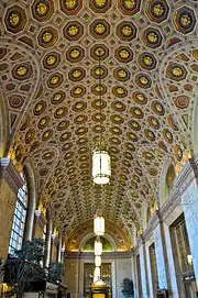 Although the exterior of the Chicago skyscrapers buildings were relatively plain, the entrance ways and lobbies were fitted out in a grand style.[85] The Unity Building, for example, was reported as including "Numidian, Alps, Green and Sienna marbles ... an artistic screen of glass and bronze ... a marble balcony" alongside "Corinthian columns with finely carved capitals, gold-leaf and silver chandeliers, and silver-plated latticework" on the elevators.[86] The aim was to project a sense of prosperity and solid financial credentials, which in turn would attract tenants willing to pay high rents.[87] For the tenants, such surroundings were good for their own business credibility and affirmed their own social status as professionals.[88]