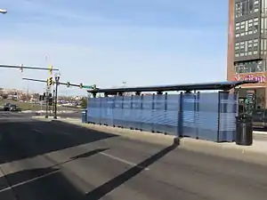 The southbound station is located at the northern end of the busway that runs down the median of Richmond Highway, but the northern station is in mixed-traffic on East Glebe Road, one block east at Main Line Boulevard.