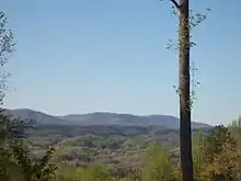 The Blue Ridge section comprises the western (or "Unaka") section of the Blue Ridge Province, the crest of which forms most of the Tennessee-North Carolina border and consists of the highest parts of the state (including Clingmans Dome, the state's highest point).[6] The Blue Ridge is subdivided into several subranges— the Iron Mountains, Roan Highlands, and Bald Mountains in the north, the Great Smoky Mountains in the center, and the Unicoi Mountains and Little Frog and Big Frog Mountain areas in the south.[7] Most of the Blue Ridge section is heavily forested and protected by various state and federal entities, the largest of which include the Great Smoky Mountains National Park and the Cherokee National Forest.[6]