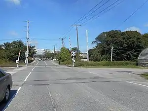 ![]() The former Eastport LIRR station site on the northwest corner of this grade crossing. | |||||||||||||||||||||