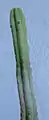Echinopsis pachanoi is native to Ecuador and Peru. Its stems are light to dark green, sometimes glaucous, with a diameter of 6–15 cm (2.4–5.9 in) and usually 6–8 ribs. The whitish areoles may produce up to seven yellow to brown spines, each up to 2 cm (0.8 in) long although typically shorter in cultivated varieties, sometimes being mostly spineless.[2] The areoles are spaced evenly along the ribs, approximately 2 cm (0.8 in) apart.[3] Echinopsis pachanoi is normally 3–6 m (10–20 ft) tall and has multiple branches, usually extending from the base but will emerge around broken branches.[2] The tallest recorded specimen was 12.2 metres (40 ft) tall.[3] White flowers are produced at the end of the stems; they open at night and last for about two days. Large numbers can be produced by well established cacti and may open new flowers over a period of weeks. The flowers are large, around 19–24 cm (7.5–9.4 in) long with a diameter of up to 20 cm (7.9 in) and are highly fragrant. There are black hairs along the length of the thick base leading to the flower. Oblong dark green fruits are produced after fertilization, about 3 cm (1.2 in) across and 5–6 cm (2.0–2.4 in) long.[2]