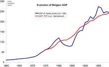 Belgium switched from the Belgian franc to the Euro as its currency after 1 January 2002. Belgian per capita GDP ranks among the world's highest. In 2008, the per capita income (PPP) was $37,500. The federal government has managed to present balanced budgets in recent years, but public debt remains high, at 99% of 2009 GDP. GDP growth in 2009 was negative at −1.5%.[18]