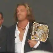 Edge was placed on the Raw brand in the 2004 WWE draft lottery on March 22, 2004, where he speared Eric Bischoff and returned to in-ring action shortly after the event.[68] At Backlash, Edge defeated Kane,[69] and on the April 19 episode of Raw, he and World Heavyweight Champion Chris Benoit won the World Tag Team Championship from Batista and Ric Flair.[70] They continued a close partnership even after losing the title; at Bad Blood, Edge and Benoit defeated La Résistance (who defeated them for the titles on the May 31 episode of Raw) in a match for the World Tag Team Championship by disqualification but did not win the titles. The team disbanded when Edge won the Intercontinental Championship at Vengeance defeating Randy Orton, thus becoming a five time Intercontinental Champion.[71] At SummerSlam, Edge defeated Chris Jericho and Batista in a triple threat match to retain the Intercontinental Championship.[72] Following a legitimate groin injury in a non-televised match, Raw General Manager Eric Bischoff stripped Edge of the Intercontinental title.[73]