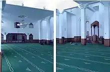 The main hall is where the Friday prayer (Jumu'ah) and the five daily prayers (salat) are held. There are two chandeliers, a vast carpet, and chairs for the elderly and disabled. Many short lectures and small discussion groups are held here, although such groups must give notice. The mosque also offers funeral services and the prayer Salat al-Janazah. There are two side entrances to the hall and a small glass room which also has a separate entrance/exit with a ramp for the disabled.
