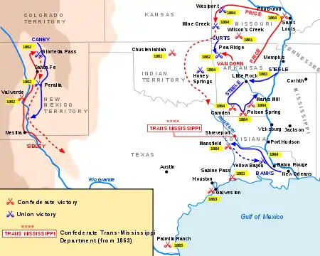 In the spring of 1864, Lt. Gen. Richard Taylor, directly under Smith's command, soundly defeated Maj. Gen. Nathaniel P. Banks at the Battle of Mansfield in the Red River Campaign on April 8, 1864.[22] After the Battle of Pleasant Hill on April 9, Smith joined Taylor and dispatched half of Taylor's army, Walker's Greyhounds, under the command of Maj. Gen. John George Walker, northward to defeat Union Maj. Gen. Frederick Steele's incursion into Arkansas. This decision, strongly opposed by Taylor, caused great enmity between the two men.[23]