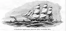On 27 May 1847, he was formally promoted to second lieutenant. A fourth training cruise followed four days later, lasting until October. On their return, Jachmann and the other officers were sent to winter quarters in Danzig.[3] In November 1848, during the Revolutions of 1848 and the concurrent First Schleswig War against Denmark, Schröder was promoted and Jachmann succeeded him as Amazone's commander. Jachmann was promoted to first lieutenant on 29 March 1849. He took Amazone to Stettin for operations against the Danish fleet. She saw no action, however, as the Danes focused their attention on the larger Reichsflotte (Imperial Fleet) in Bremen.[4] On 15 July 1850, the Danish blockade fleet entered Swinemünde and seized several Prussian vessels; Jachmann did not sortie to recapture the vessels, which cast suspicion on him and nearly cost him his command. Amazone, of only 356 metric tons (350 long tons; 392 short tons), was too weak to challenge the Danish and the only other Prussian vessels in the area were small gunboats of even lesser value as warships. As a result, Jachmann was exonerated.[5]