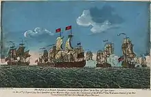In 1747 Boscawen was ordered to join Admiral Anson and took an active part in the first Battle of Cape Finisterre.[15]:290[4]:186 The British fleet sighted the French fleet on 3 May. The French fleet under Admiral de la Jonquière was convoying its merchant fleet to France and the British attacked. The French fleet was almost completely annihilated with all but two of the escorts taken and six merchantmen. Boscawen was injured in the shoulder during the battle by a musket ball.[15]:291 Once more the French captain, M. de Hocquart became Boscawen's prisoner and was taken to England.[16]