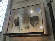 His death took place in the Palace of Westminster.[97][lower-alpha 8] He was buried with great state in Canterbury Cathedral on 29 September, and the directions contained in his will were followed at his funeral and in the details of his tomb.[98] It has a bronze effigy beneath a tester depicting the Holy Trinity with his heraldic achievements – his surcoat, helmet, shield and gauntlets[98] – hung over the tester; they have been replaced with replicas, and the originals now reside in a glass-fronted cabinet within the Cathedral. His epitaph[98] inscribed around his effigy reads: