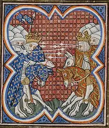 Among the prisoners was the French marshal Arnoul d'Audrehem, whom the prince had formerly taken prisoner at Poitiers, and whom he had released on d'Audrehem giving his word that he would not bear arms against the prince until his ransom was paid. When the prince saw him he reproached him bitterly, and called him "liar and traitor".[73] D'Audrehem denied that he was either, and the prince asked him whether he would submit to the judgment of a body of knights. To this d'Audrehem agreed, and after he had dined the prince chose twelve knights, four English, four Gascons, and four Bretons, to judge between himself and the marshal. After he had stated his case, d'Audrehem replied that he had not broken his word, for the army the prince led was not his own; he was merely in the pay of Peter. The knights considered that this view of the prince's position was sound, and gave their verdict for d'Audrehem.[75]