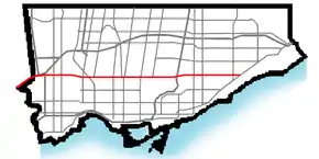 | Ninth Line Winston Churchill Boulevard Mavis Road Hurontario Street Kipling Avenue Islington Avenue Jane Street Black Creek Drive Keele Street Dufferin Street Bathurst Street Avenue Road Yonge Street Bayview Avenue Leslie Street Don Mills Road Victoria Park Avenue Warden Avenue Kennedy Road Markham Road | |||||||