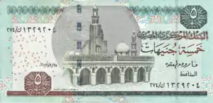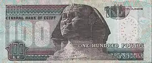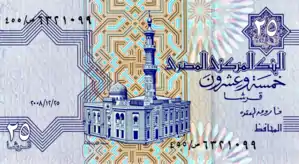 All Egyptian banknotes are bilingual, with Arabic texts and Eastern Arabic numerals on the obverse, and English texts and Western Arabic numerals on the reverse. Obverse designs tend to feature an Islamic building with reverse designs featuring Ancient Egyptian motifs (buildings, statues and inscriptions). During December 2006, it was mentioned in articles in Al Ahram and Al Akhbar newspapers that there were plans to introduce £200 and £500 notes. As of 2019, there are £200 notes circulating but there are still no plans for making £500 notes.[9] Starting from 2011 the 25, 50 piastres and £1 banknotes have been phased out and replaced by more extensive use of coins. As of June 2016 the National Bank of Egypt reintroduced the £1 banknote into circulation[10] as well as the 25 and 50 piastres notes in response to a shortage of small change.