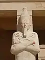 This example to the right depicts a man named Ay who achieved the exalted religious positions of Second Prophet of Amun and High Priest of Mut at Thebes. His career flourished during the reign of Tutankhamun, when the statue was made. The cartouches of King Ay, Tutankhamun's successor appearing on the statue, were an attempt by an artisan to "update" the sculpture.[10]